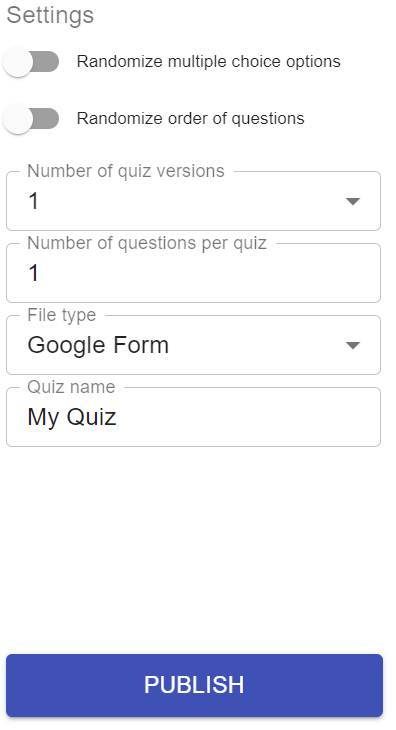 Once you're done editing, it's time to publish your quiz. Clicking "Preview and Publish" from the quiz editor will bring you to a page where you can generate your quizzes based on multiple settings.