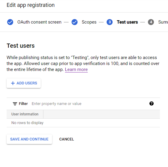 3.5. On the 3rd page, add any users that will test your app. These are just testers that have a Google account, and you can add their emails here. This will be important if you intend on testing a production version of the add-on using a test deployment.