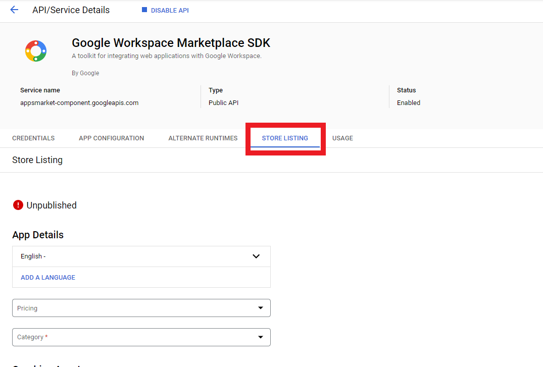8.1. Go back to your GCP project page and go to the Google Workspace Marketplace SDK page where the "Store Listing" tab is in step 6. Sometimes this is hard to find too but you just need to click on "Enable APIs & Services" and then in the list of APIs on the right, GWM SDK will be listed.