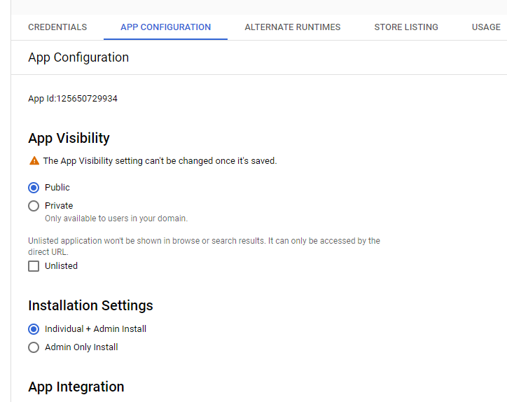 6.2. Then, click on the "App Configuration" tab. The "App Visibility" and "Installation Settings" should be set to their default settings like so: