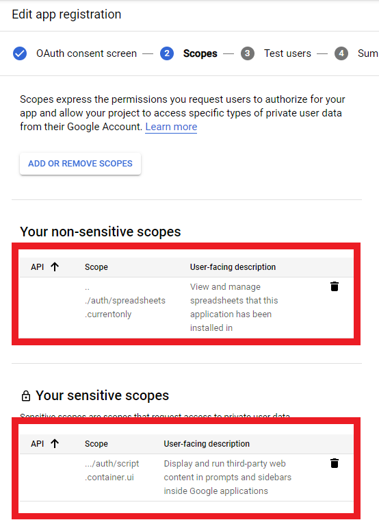 3.4. The 2nd page is the important one. This is where you need to fill out the scopes that your add-on uses. Scopes are just the permissions that the user will grant your app. If you are working with Google App Script, make sure these are consist with the appsscript.json file. The scopes will look something like this: