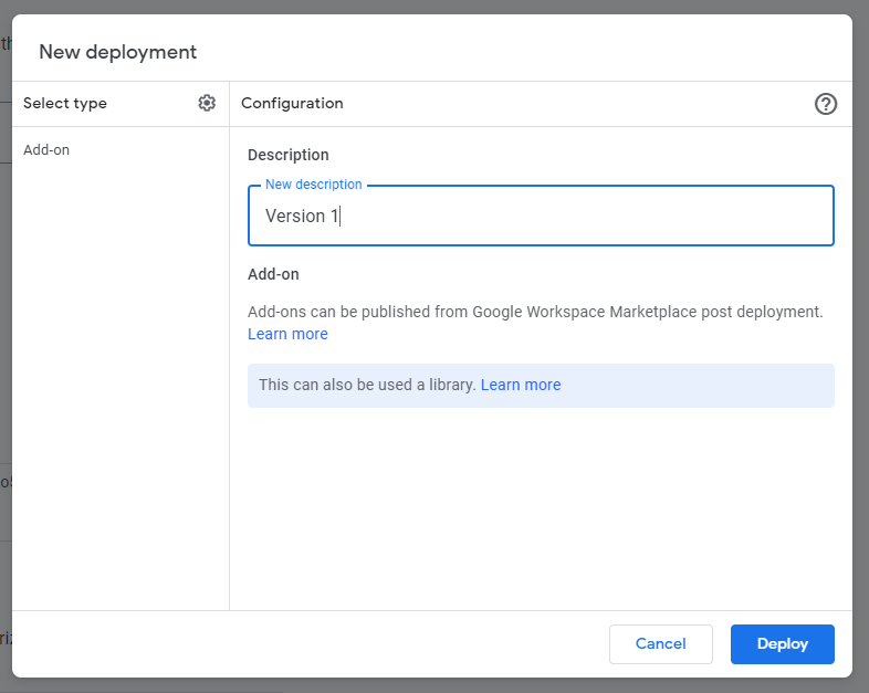 For a Google Sheets or Docs add-on, etc., select "Add-on". There are also options for web apps, API executable and so on. Pick whatever is suitable for your add-on and proceed. Next, you will be asked to give a description for your deployment. Name it whatever you like and click "Deploy".