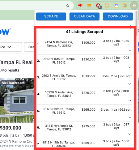 The Z Real Estate Scraper Chrome Extension allows you to easily scrape Zillow real estate listings data with no code or technical knowledge. Scraping is just a term that means extract data from a website automatically. The extension allows you to download the data into a nicely formatted CSV file or Google Sheet organized by listing price, address, # of beds, baths, zip code, square footage and even agent/FSBO contact info, the year the property was built, and more. Here are the core features: