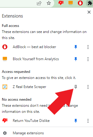 To pin the extension for easy access, click on the puzzle icon at the top right, scroll down to the Z Real Estate Scraper Extension, and click the pin button.