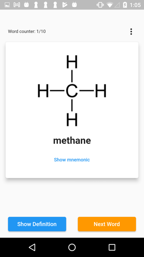 During testing, you can click a button to show the definition, synonyms, and mnemonics. If you don't remember a particular word, you can add it to a "Forgotten Words" list to test it later.