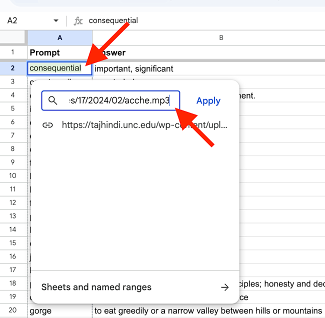 Open up your Google Sheets file and for the specific card, highlight the prompt or answer text and embed the audio link like this: