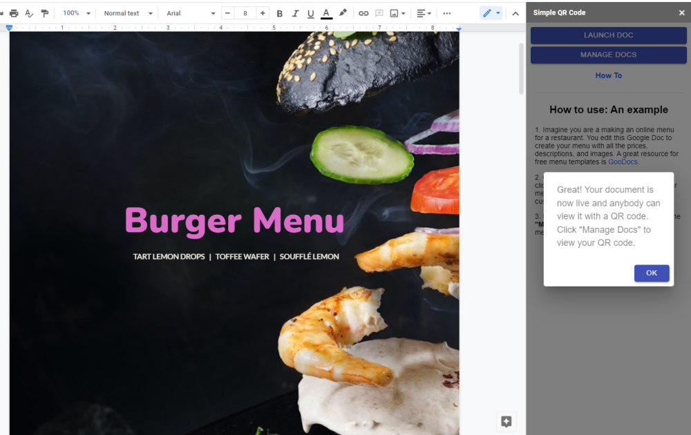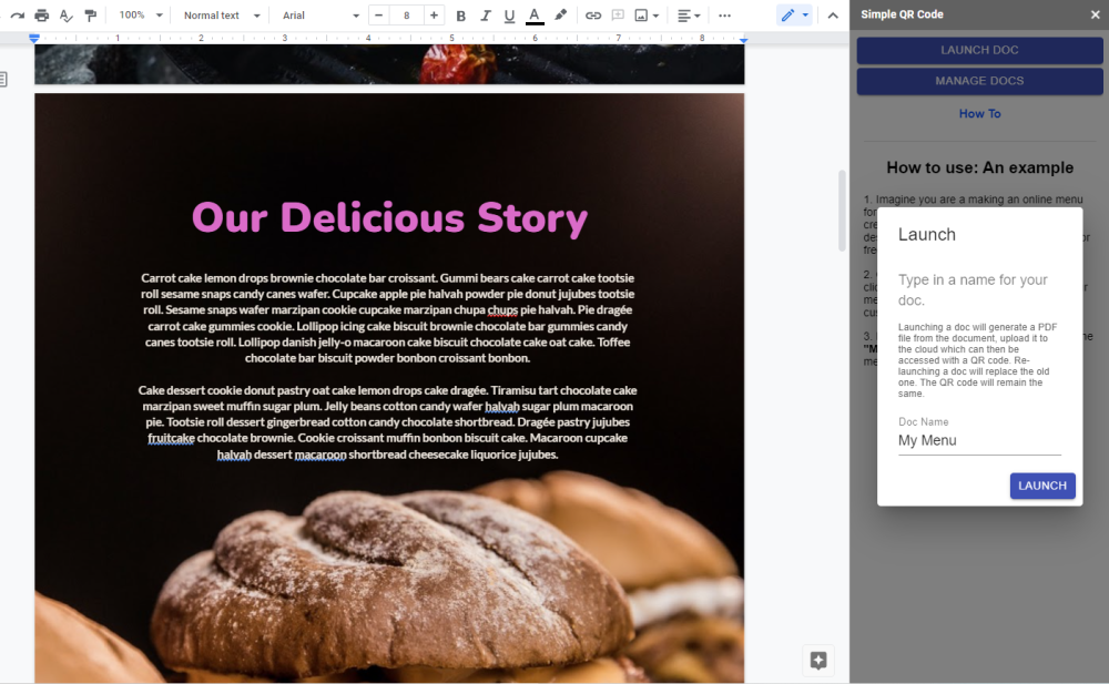 The Simple QR Code Google Docs™ add-on is a very simple way to use Google Docs to create your document, whatever that may be, upload it to the web, and then allow users to access it with a QR code, perfect for restaurant personnel, small business owners, community managers, administrators for companies and more! The process is straightforward and you can have an online document accessible by QR code in seconds. No website needed, no hassle, just easy.