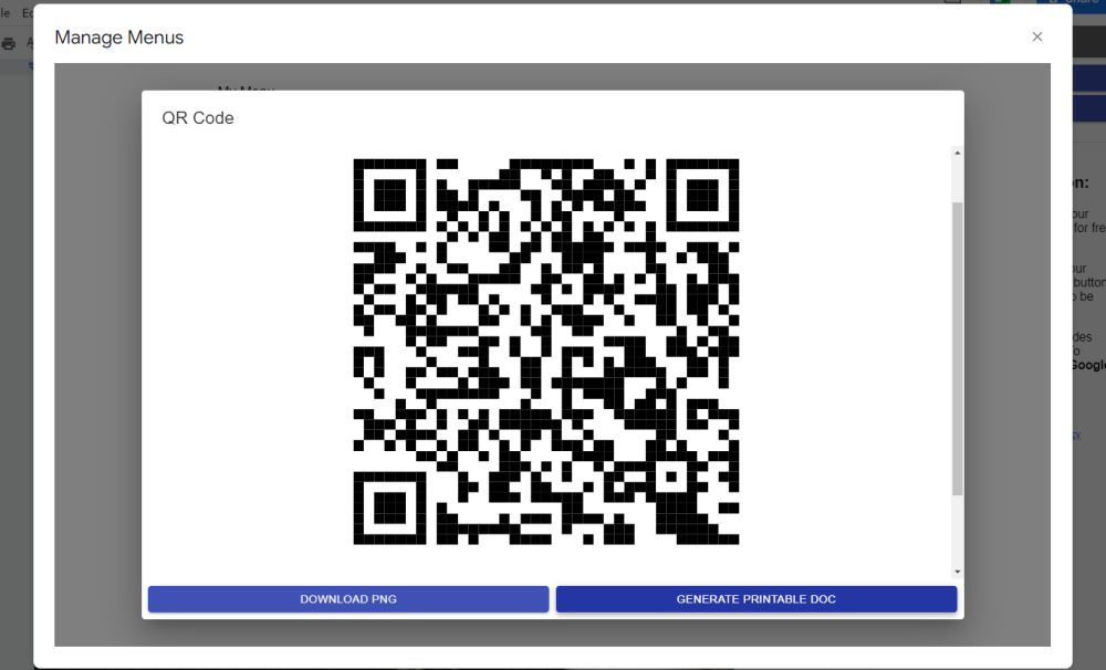 Choose to download the QR code as a high quality PNG file or generate a separate Google Doc that will be saved to your Google Drive. In this Google Doc, you will have multiple QR codes ready to be printed out for use at your business.