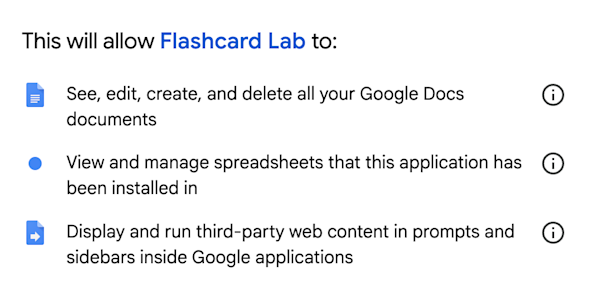 We understand that users may feel uncertain about installing the Flashcard Lab Google Sheets add-on due to concern over the level of permission granting needed to use the app.