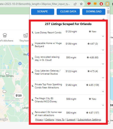 To scrape, just click the "Scrape" button and the extension will automatically scroll and extract the listings on the page. You will see the information of the scraped listings in the popup like this: